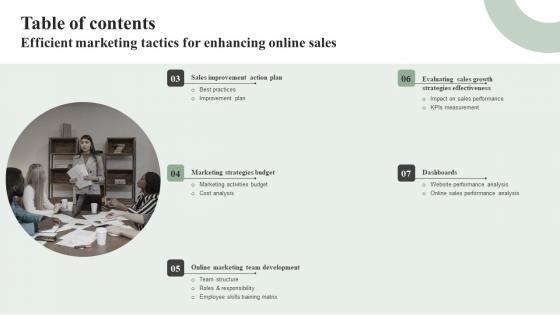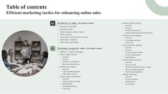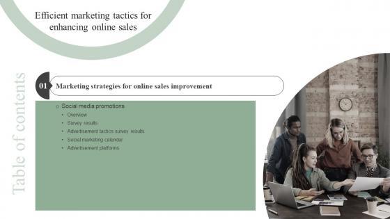 Do you have to make sure that everyone on your team knows about any specific topic I yes, then you should give Table Of Contents Efficient Marketing Tactics For Enhancing Online Sales Inspiration Pdf a try. Our experts have put a lot of knowledge and effort into creating this impeccable Table Of Contents Efficient Marketing Tactics For Enhancing Online Sales Inspiration Pdf. You can use this template for your upcoming presentations, as the slides are perfect to represent even the tiniest detail. You can download these templates from the Slidegeeks website and these are easy to edit. So grab these today Our Table Of Contents Efficient Marketing Tactics For Enhancing Online Sales Inspiration Pdf are topically designed to provide an attractive backdrop to any subject. Use them to look like a presentation pro.