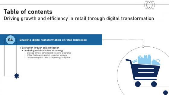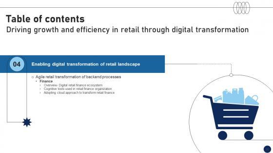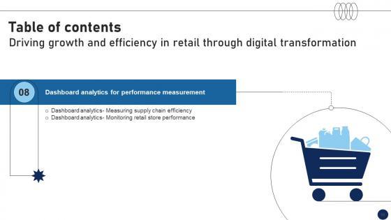 Here you can discover an assortment of the finest PowerPoint and Google Slides templates. With these templates, you can create presentations for a variety of purposes while simultaneously providing your audience with an eye-catching visual experience. Download Table Of Contents Driving Growth And Efficiency In Retail Through Digital Transformation DT SS V to deliver an impeccable presentation. These templates will make your job of preparing presentations much quicker, yet still, maintain a high level of quality. Slidegeeks has experienced researchers who prepare these templates and write high-quality content for you. Later on, you can personalize the content by editing the Table Of Contents Driving Growth And Efficiency In Retail Through Digital Transformation DT SS V. Our Table Of Contents Driving Growth And Efficiency In Retail Through Digital Transformation DT SS V are topically designed to provide an attractive backdrop to any subject. Use them to look like a presentation pro.