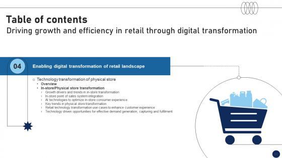 Welcome to our selection of the R68 Table Of Contents Driving Growth And Efficiency In Retail Through Digital Transformation DT SS V. These are designed to help you showcase your creativity and bring your sphere to life. Planning and Innovation are essential for any business that is just starting out. This collection contains the designs that you need for your everyday presentations. All of our PowerPoints are 100 percent editable, so you can customize them to suit your needs. This multi-purpose template can be used in various situations. Grab these presentation templates today. Our R68 Table Of Contents Driving Growth And Efficiency In Retail Through Digital Transformation DT SS V are topically designed to provide an attractive backdrop to any subject. Use them to look like a presentation pro.