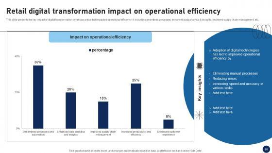 This slide presents the key impact of digital transformation in various areas that impacted operational efficiency. It includes streamlines processes, enhanced data analytics and insights, improved supply chain management, etc.Explore a selection of the finest Retail Digital Transformation Impact On Operational Efficiency DT SS V here. With a plethora of professionally designed and pre-made slide templates, you can quickly and easily find the right one for your upcoming presentation. You can use our Retail Digital Transformation Impact On Operational Efficiency DT SS V to effectively convey your message to a wider audience. Slidegeeks has done a lot of research before preparing these presentation templates. The content can be personalized and the slides are highly editable. Grab templates today from Slidegeeks. This slide presents the key impact of digital transformation in various areas that impacted operational efficiency. It includes streamlines processes, enhanced data analytics and insights, improved supply chain management, etc.