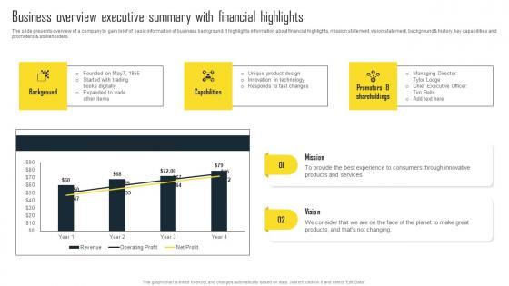The slide presents overview of a company to gain brief of basic information of business background. It highlights information about financial highlights, mission statement, vision statement, backgroundand history, key capabilities and promoters and stakeholders. There are so many reasons you need a Business Overview Executive Summary Efficient Plan For Conducting Competitor Clipart Pdf. The first reason is you can not spend time making everything from scratch, Thus, Slidegeeks has made presentation templates for you too. You can easily download these templates from our website easily. The slide presents overview of a company to gain brief of basic information of business background. It highlights information about financial highlights, mission statement, vision statement, backgroundand history, key capabilities and promoters and stakeholders.