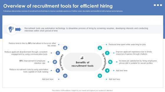 Followings slide provides overview of recruitment tools that helps to improve candidate experience. It further covers description and benefits for both employer and employees. Are you searching for a Integrating Automation For Effective Business Overview Of Recruitment Tools For Efficient Hiring that is uncluttered, straightforward, and original Its easy to edit, and you can change the colors to suit your personal or business branding. For a presentation that expresses how much effort you have put in, this template is ideal With all of its features, including tables, diagrams, statistics, and lists, its perfect for a business plan presentation. Make your ideas more appealing with these professional slides. Download Integrating Automation For Effective Business Overview Of Recruitment Tools For Efficient Hiring from Slidegeeks today. Followings slide provides overview of recruitment tools that helps to improve candidate experience. It further covers description and benefits for both employer and employees.