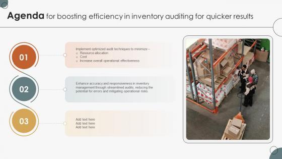 Find a pre-designed and impeccable Agenda For Boosting Efficiency In Inventory Auditing For Quicker Results. The templates can ace your presentation without additional effort. You can download these easy-to-edit presentation templates to make your presentation stand out from others. So, what are you waiting for Download the template from Slidegeeks today and give a unique touch to your presentation. Our Agenda For Boosting Efficiency In Inventory Auditing For Quicker Results are topically designed to provide an attractive backdrop to any subject. Use them to look like a presentation pro.