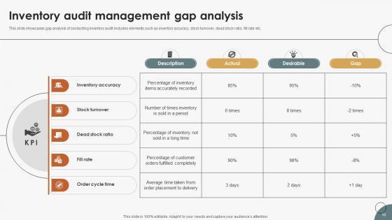 This slide showcases gap analysis of conducting inventory audit includes elements such as inventory accuracy, stock turnover, dead stock ratio, fill rate etc. Get a simple yet stunning designed Boosting Efficiency In Inventory Audit Management Gap Analysis. It is the best one to establish the tone in your meetings. It is an excellent way to make your presentations highly effective. So, download this PPT today from Slidegeeks and see the positive impacts. Our easy-to-edit Boosting Efficiency In Inventory Audit Management Gap Analysis can be your go-to option for all upcoming conferences and meetings. So, what are you waiting for Grab this template today. This slide showcases gap analysis of conducting inventory audit includes elements such as inventory accuracy, stock turnover, dead stock ratio, fill rate etc.