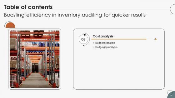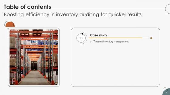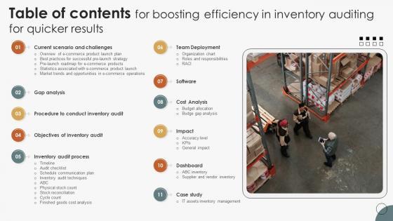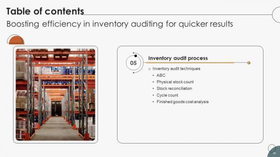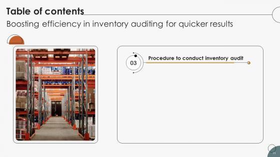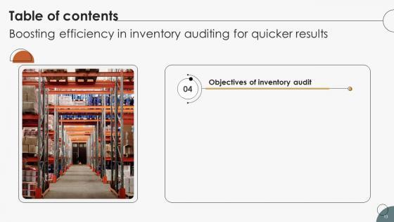 Find a pre-designed and impeccable Table Of Contents Boosting Efficiency In Inventory Auditing For Quicker Results. The templates can ace your presentation without additional effort. You can download these easy-to-edit presentation templates to make your presentation stand out from others. So, what are you waiting for Download the template from Slidegeeks today and give a unique touch to your presentation. Our Table Of Contents Boosting Efficiency In Inventory Auditing For Quicker Results are topically designed to provide an attractive backdrop to any subject. Use them to look like a presentation pro.