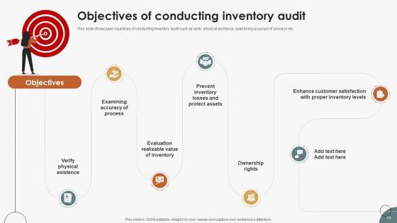 This slide showcases objectives of conducting inventory audit such as verify physical existence, examining accuracy of process etc. Coming up with a presentation necessitates that the majority of the effort goes into the content and the message you intend to convey. The visuals of a PowerPoint presentation can only be effective if it supplements and supports the story that is being told. Keeping this in mind our experts created Boosting Efficiency In Inventory Objectives Of Conducting Inventory Audit to reduce the time that goes into designing the presentation. This way, you can concentrate on the message while our designers take care of providing you with the right template for the situation. This slide showcases objectives of conducting inventory audit such as verify physical existence, examining accuracy of process etc.