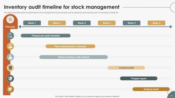This slide showcases inventory audit timeline for stock management includes elements such as prepare pre audit checklist, plan communication schedule etc. Do you have an important presentation coming up Are you looking for something that will make your presentation stand out from the rest Look no further than Boosting Efficiency In Inventory Audit Timeline For Stock Management. With our professional designs, you can trust that your presentation will pop and make delivering it a smooth process. And with Slidegeeks, you can trust that your presentation will be unique and memorable. So why wait Grab Boosting Efficiency In Inventory Audit Timeline For Stock Management today and make your presentation stand out from the rest This slide showcases inventory audit timeline for stock management includes elements such as prepare pre audit checklist, plan communication schedule etc.