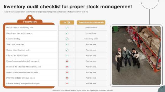 This slide showcases inventory audit checklist for proper stock management such as make schedule for inventory audit etc. Do you have to make sure that everyone on your team knows about any specific topic I yes, then you should give Boosting Efficiency In Inventory Audit Checklist For Proper Stock Management a try. Our experts have put a lot of knowledge and effort into creating this impeccable Boosting Efficiency In Inventory Audit Checklist For Proper Stock Management. You can use this template for your upcoming presentations, as the slides are perfect to represent even the tiniest detail. You can download these templates from the Slidegeeks website and these are easy to edit. So grab these today This slide showcases inventory audit checklist for proper stock management such as make schedule for inventory audit etc.