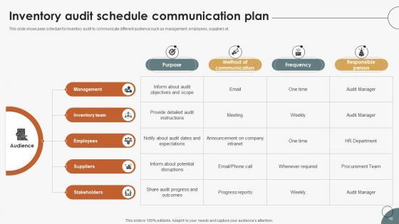 This slide showcases schedule for inventory audit to communicate different audience such as management, employees, suppliers et. Present like a pro with Boosting Efficiency In Inventory Audit Schedule Communication Plan. Create beautiful presentations together with your team, using our easy-to-use presentation slides. Share your ideas in real-time and make changes on the fly by downloading our templates. So whether you are in the office, on the go, or in a remote location, you can stay in sync with your team and present your ideas with confidence. With Slidegeeks presentation got a whole lot easier. Grab these presentations today. This slide showcases schedule for inventory audit to communicate different audience such as management, employees, suppliers et.