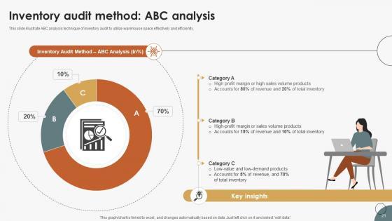 This slide illustrate ABC analysis technique of inventory audit to utilize warehouse space effectively and efficiently. From laying roadmaps to briefing everything in detail, our templates are perfect for you. You can set the stage with your presentation slides. All you have to do is download these easy-to-edit and customizable templates. Boosting Efficiency In Inventory Audit Method ABC Analysis will help you deliver an outstanding performance that everyone would remember and praise you for. Do download this presentation today. This slide illustrate ABC analysis technique of inventory audit to utilize warehouse space effectively and efficiently.