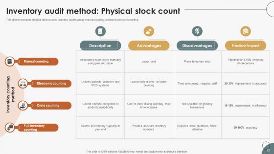This slide showcases physical stock count of inventory audit such as manual counting, electronic and cycle counting. Here you can discover an assortment of the finest PowerPoint and Google Slides templates. With these templates, you can create presentations for a variety of purposes while simultaneously providing your audience with an eye-catching visual experience. Download Inventory Audit Method Physical Stock Count Boosting Efficiency In Inventory Auditing to deliver an impeccable presentation. These templates will make your job of preparing presentations much quicker, yet still, maintain a high level of quality. Slidegeeks has experienced researchers who prepare these templates and write high-quality content for you. Later on, you can personalize the content by editing the Inventory Audit Method Physical Stock Count Boosting Efficiency In Inventory Auditing. This slide showcases physical stock count of inventory audit such as manual counting, electronic and cycle counting.