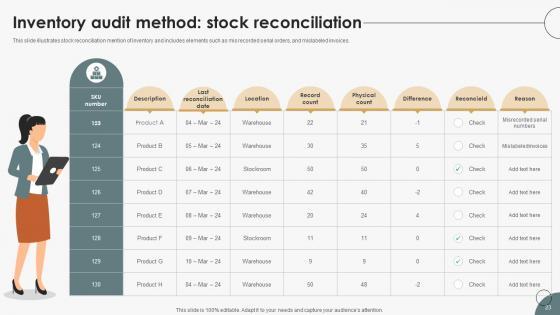 This slide illustrates stock reconciliation mention of inventory and includes elements such as mis recorded serial orders, and mislabeled invoices. This Inventory Audit Method Stock Reconciliation Boosting Efficiency In Inventory Auditing from Slidegeeks makes it easy to present information on your topic with precision. It provides customization options, so you can make changes to the colors, design, graphics, or any other component to create a unique layout. It is also available for immediate download, so you can begin using it right away. Slidegeeks has done good research to ensure that you have everything you need to make your presentation stand out. Make a name out there for a brilliant performance. This slide illustrates stock reconciliation mention of inventory and includes elements such as mis recorded serial orders, and mislabeled invoices.
