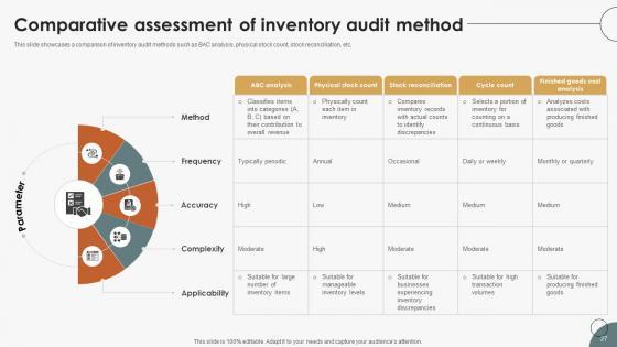 This slide showcases a comparison of inventory audit methods such as BAC analysis, physical stock count, stock reconciliation, etc. If you are looking for a format to display your unique thoughts, then the professionally designed Boosting Efficiency In Inventory Comparative Assessment Of Inventory Audit Method is the one for you. You can use it as a Google Slides template or a PowerPoint template. Incorporate impressive visuals, symbols, images, and other charts. Modify or reorganize the text boxes as you desire. Experiment with shade schemes and font pairings. Alter, share or cooperate with other people on your work. Download Boosting Efficiency In Inventory Comparative Assessment Of Inventory Audit Method and find out how to give a successful presentation. Present a perfect display to your team and make your presentation unforgettable. This slide showcases a comparison of inventory audit methods such as BAC analysis, physical stock count, stock reconciliation, etc.