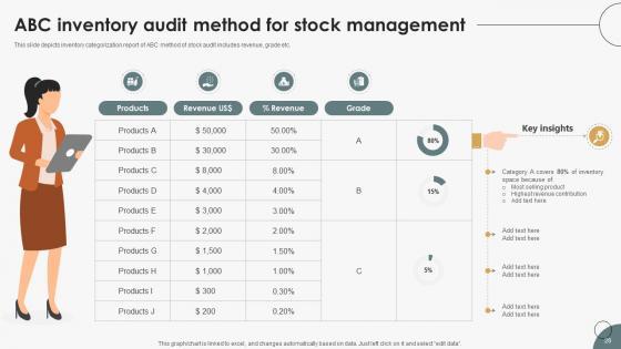 This slide depicts inventory categorization report of ABC method of stock audit includes revenue, grade etc. Create an editable Boosting Efficiency In Inventory ABC Inventory Audit Method For Stock Management that communicates your idea and engages your audience. Whether you are presenting a business or an educational presentation, pre-designed presentation templates help save time. Boosting Efficiency In Inventory ABC Inventory Audit Method For Stock Management is highly customizable and very easy to edit, covering many different styles from creative to business presentations. Slidegeeks has creative team members who have crafted amazing templates. So, go and get them without any delay. This slide depicts inventory categorization report of ABC method of stock audit includes revenue, grade etc.