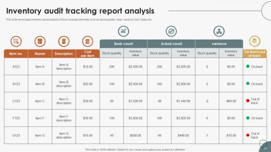 This slide showcases inventory report analysis of stock includes elements such as stock quantity, value, variance, track status etc. Whether you have daily or monthly meetings, a brilliant presentation is necessary. Boosting Efficiency In Inventory Audit Tracking Report Analysis can be your best option for delivering a presentation. Represent everything in detail using Boosting Efficiency In Inventory Audit Tracking Report Analysis and make yourself stand out in meetings. The template is versatile and follows a structure that will cater to your requirements. All the templates prepared by Slidegeeks are easy to download and edit. Our research experts have taken care of the corporate themes as well. So, give it a try and see the results. This slide showcases inventory report analysis of stock includes elements such as stock quantity, value, variance, track status etc.