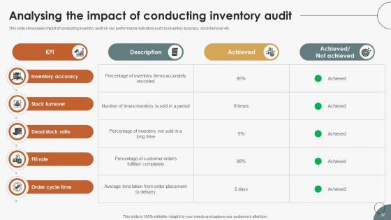 This slide showcases impact of conducting inventory audit on key performance indicators such as inventory accuracy, stock turnover etc. Slidegeeks is one of the best resources for PowerPoint templates. You can download easily and regulate Boosting Efficiency In Inventory Analysing The Impact Of Conducting Inventory Audit for your personal presentations from our wonderful collection. A few clicks is all it takes to discover and get the most relevant and appropriate templates. Use our Templates to add a unique zing and appeal to your presentation and meetings. All the slides are easy to edit and you can use them even for advertisement purposes. This slide showcases impact of conducting inventory audit on key performance indicators such as inventory accuracy, stock turnover etc.