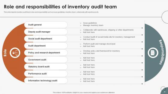 This slide depicts inventory audit team roles and responsibility such as issue guidelines, inventory team, collaborate with warehouse etc. Welcome to our selection of the Boosting Efficiency In Inventory Role And Responsibilities Of Inventory Audit Team. These are designed to help you showcase your creativity and bring your sphere to life. Planning and Innovation are essential for any business that is just starting out. This collection contains the designs that you need for your everyday presentations. All of our PowerPoints are 100Percent editable, so you can customize them to suit your needs. This multi-purpose template can be used in various situations. Grab these presentation templates today. This slide depicts inventory audit team roles and responsibility such as issue guidelines, inventory team, collaborate with warehouse etc.