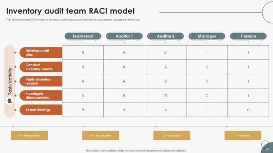 This slide showcases RACI metric for inventory audit team such as responsible, accountable, consulted and informed. Do you know about Slidesgeeks Inventory Audit Team RACI Model Boosting Efficiency In Inventory Auditing These are perfect for delivering any kind od presentation. Using it, create PowerPoint presentations that communicate your ideas and engage audiences. Save time and effort by using our pre-designed presentation templates that are perfect for a wide range of topic. Our vast selection of designs covers a range of styles, from creative to business, and are all highly customizable and easy to edit. Download as a PowerPoint template or use them as Google Slides themes. This slide showcases RACI metric for inventory audit team such as responsible, accountable, consulted and informed.