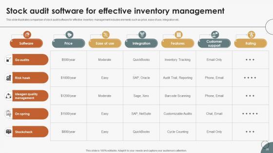This slide illustrates comparison of stock audit software for effective inventory management includes elements such as price, ease of use, integration etc. Explore a selection of the finest Boosting Efficiency In Inventory Stock Audit Software For Effective Inventory Management here. With a plethora of professionally designed and pre-made slide templates, you can quickly and easily find the right one for your upcoming presentation. You can use our Boosting Efficiency In Inventory Stock Audit Software For Effective Inventory Management to effectively convey your message to a wider audience. Slidegeeks has done a lot of research before preparing these presentation templates. The content can be personalized and the slides are highly editable. Grab templates today from Slidegeeks. This slide illustrates comparison of stock audit software for effective inventory management includes elements such as price, ease of use, integration etc.