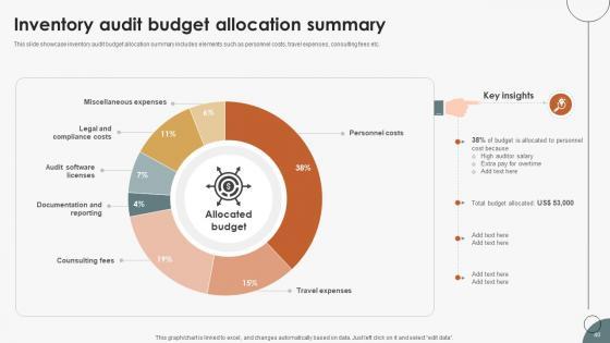 This slide showcase inventory audit budget allocation summary includes elements such as personnel costs, travel expenses, consulting fees etc. Want to ace your presentation in front of a live audience Our Boosting Efficiency In Inventory Audit Budget Allocation Summary can help you do that by engaging all the users towards you. Slidegeeks experts have put their efforts and expertise into creating these impeccable powerpoint presentations so that you can communicate your ideas clearly. Moreover, all the templates are customizable, and easy-to-edit and downloadable. Use these for both personal and commercial use. This slide showcase inventory audit budget allocation summary includes elements such as personnel costs, travel expenses, consulting fees etc.