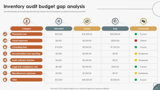 This slide illustrates stock audit budget allocation gap analysis to find out discrepancy in budget and make necessary action. Are you searching for a Inventory Audit Budget Gap Analysis Boosting Efficiency In Inventory Auditing that is uncluttered, straightforward, and original Its easy to edit, and you can change the colors to suit your personal or business branding. For a presentation that expresses how much effort you have put in, this template is ideal With all of its features, including tables, diagrams, statistics, and lists, its perfect for a business plan presentation. Make your ideas more appealing with these professional slides. Download Inventory Audit Budget Gap Analysis Boosting Efficiency In Inventory Auditing from Slidegeeks today. This slide illustrates stock audit budget allocation gap analysis to find out discrepancy in budget and make necessary action.