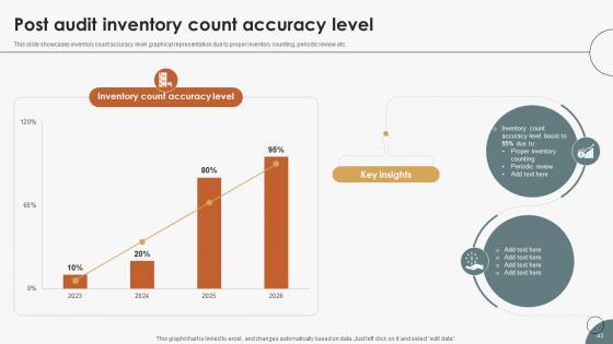 This slide showcases inventory count accuracy level graphical representation due to proper inventory counting, periodic review etc. This modern and well-arranged Boosting Efficiency In Inventory Post Audit Inventory Count Accuracy Level provides lots of creative possibilities. It is very simple to customize and edit with the Powerpoint Software. Just drag and drop your pictures into the shapes. All facets of this template can be edited with Powerpoint, no extra software is necessary. Add your own material, put your images in the places assigned for them, adjust the colors, and then you can show your slides to the world, with an animated slide included. This slide showcases inventory count accuracy level graphical representation due to proper inventory counting, periodic review etc.
