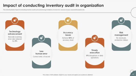 This slide illustrates impact of conducting inventory audit such as technology limitations, human error, accuracy issues, seasonal fluctuations etc. Are you in need of a template that can accommodate all of your creative concepts This one is crafted professionally and can be altered to fit any style. Use it with Google Slides or PowerPoint. Include striking photographs, symbols, depictions, and other visuals. Fill, move around, or remove text boxes as desired. Test out color palettes and font mixtures. Edit and save your work, or work with colleagues. Download Boosting Efficiency In Inventory Impact Of Conducting Inventory Audit In Organization and observe how to make your presentation outstanding. Give an impeccable presentation to your group and make your presentation unforgettable. This slide illustrates impact of conducting inventory audit such as technology limitations, human error, accuracy issues, seasonal fluctuations etc.
