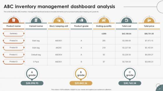 This slide illustrates ABC inventory management dashboard analysis includes elements such as product name, stock keeping unit, grade etc. Boost your pitch with our creative Boosting Efficiency In ABC Inventory Management Dashboard Analysis. Deliver an awe-inspiring pitch that will mesmerize everyone. Using these presentation templates you will surely catch everyones attention. You can browse the ppts collection on our website. We have researchers who are experts at creating the right content for the templates. So you do not have to invest time in any additional work. Just grab the template now and use them. This slide illustrates ABC inventory management dashboard analysis includes elements such as product name, stock keeping unit, grade etc.