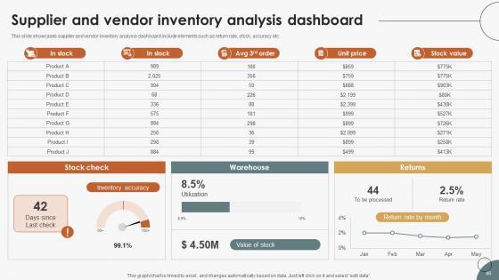 This slide showcases supplier and vendor inventory analysis dashboard include elements such as return rate, stock, accuracy etc. The best PPT templates are a great way to save time, energy, and resources. Slidegeeks have 100 percent editable powerpoint slides making them incredibly versatile. With these quality presentation templates, you can create a captivating and memorable presentation by combining visually appealing slides and effectively communicating your message. Download Boosting Efficiency In Inventory Supplier And Vendor Inventory Analysis Dashboard from Slidegeeks and deliver a wonderful presentation. This slide showcases supplier and vendor inventory analysis dashboard include elements such as return rate, stock, accuracy etc.