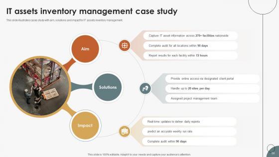 This slide illustrates cases study with aim, solutions and impact for IT assets inventory management. Crafting an eye-catching presentation has never been more straightforward. Let your presentation shine with this tasteful yet straightforward Boosting Efficiency In Inventory It Assets Inventory Management Case Study template. It offers a minimalistic and classy look that is great for making a statement. The colors have been employed intelligently to add a bit of playfulness while still remaining professional. Construct the ideal Boosting Efficiency In Inventory It Assets Inventory Management Case Study that effortlessly grabs the attention of your audience Begin now and be certain to wow your customers This slide illustrates cases study with aim, solutions and impact for IT assets inventory management.