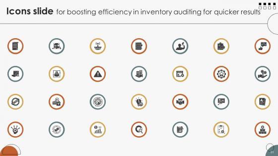 The Icons Slide For Boosting Efficiency In Inventory Auditing For Quicker Results is a compilation of the most recent design trends as a series of slides. It is suitable for any subject or industry presentation, containing attractive visuals and photo spots for businesses to clearly express their messages. This template contains a variety of slides for the user to input data, such as structures to contrast two elements, bullet points, and slides for written information. Slidegeeks is prepared to create an impression. Our Icons Slide For Boosting Efficiency In Inventory Auditing For Quicker Results are topically designed to provide an attractive backdrop to any subject. Use them to look like a presentation pro.