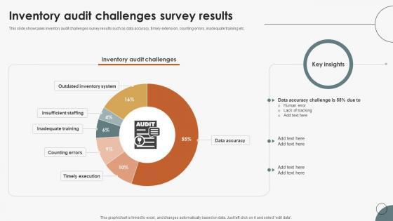 This slide showcases inventory audit challenges survey results such as data accuracy, timely extension, counting errors, inadequate training etc. Retrieve professionally designed Inventory Audit Challenges Survey Results Boosting Efficiency In Inventory Auditing to effectively convey your message and captivate your listeners. Save time by selecting pre-made slideshows that are appropriate for various topics, from business to educational purposes. These themes come in many different styles, from creative to corporate, and all of them are easily adjustable and can be edited quickly. Access them as PowerPoint templates or as Google Slides themes. You do not have to go on a hunt for the perfect presentation because Slidegeeks got you covered from everywhere. This slide showcases inventory audit challenges survey results such as data accuracy, timely extension, counting errors, inadequate training etc.