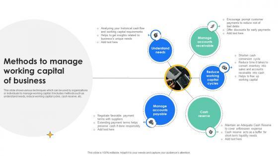 This slide shows various techniques which can be used by organizations or individuals to manage working capital. It includes methods such as understand needs, reduce working capital cycles, cash reserve, etc. Explore a selection of the finest Methods To Manage Working Capital Of Business Effective And Efficient Tools To Develop Fin SS V here. With a plethora of professionally designed and pre-made slide templates, you can quickly and easily find the right one for your upcoming presentation. You can use our Methods To Manage Working Capital Of Business Effective And Efficient Tools To Develop Fin SS V to effectively convey your message to a wider audience. Slidegeeks has done a lot of research before preparing these presentation templates. The content can be personalized and the slides are highly editable. Grab templates today from Slidegeeks. This slide shows various techniques which can be used by organizations or individuals to manage working capital. It includes methods such as understand needs, reduce working capital cycles, cash reserve, etc.