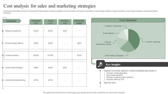 Following slide provides overview of cost spent of implementing marketing strategies. Its key elements are Instagram advertising, email campaign software, content marketing, social media campaigns, website optimization testing etc. From laying roadmaps to briefing everything in detail, our templates are perfect for you. You can set the stage with your presentation slides. All you have to do is download these easy-to-edit and customizable templates. Cost Analysis For Sales And Marketing Strategies Efficient Marketing Tactics Diagrams Pdf will help you deliver an outstanding performance that everyone would remember and praise you for. Do download this presentation today. Following slide provides overview of cost spent of implementing marketing strategies. Its key elements are Instagram advertising, email campaign software, content marketing, social media campaigns, website optimization testing etc.