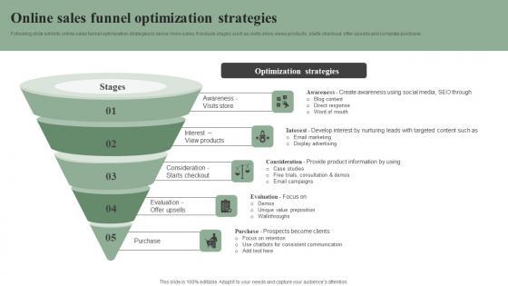 Following slide exhibits online sales funnel optimization strategies to derive more sales. It include stages such as visits store, views products, starts checkout, offer upsells and complete purchase. Boost your pitch with our creative Online Sales Funnel Optimization Strategies Efficient Marketing Tactics Elements Pdf. Deliver an awe-inspiring pitch that will mesmerize everyone. Using these presentation templates you will surely catch everyones attention. You can browse the ppts collection on our website. We have researchers who are experts at creating the right content for the templates. So you do not have to invest time in any additional work. Just grab the template now and use them. Following slide exhibits online sales funnel optimization strategies to derive more sales. It include stages such as visits store, views products, starts checkout, offer upsells and complete purchase.
