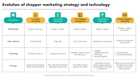 This slide represents evolution for shopper marketing. It covers five generation such as mass marketing, trade marketing, category marketing, in-store marketing and shopper marketing. Do you have an important presentation coming up Are you looking for something that will make your presentation stand out from the rest Look no further than Evolution Of Shopper Marketing Efficient Shopper Marketing Process For Enhancing Professional Pdf. With our professional designs, you can trust that your presentation will pop and make delivering it a smooth process. And with Slidegeeks, you can trust that your presentation will be unique and memorable. So why wait Grab Evolution Of Shopper Marketing Efficient Shopper Marketing Process For Enhancing Professional Pdf today and make your presentation stand out from the rest. This slide represents evolution for shopper marketing. It covers five generation such as mass marketing, trade marketing, category marketing, in-store marketing and shopper marketing.