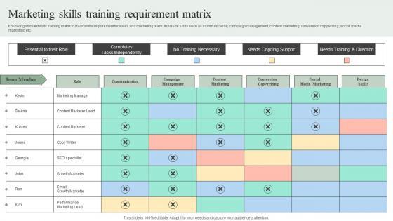 Following slide exhibits training matrix to track skills requirement for sales and marketing team. It include skills such as communication, campaign management, content marketing, conversion copywriting, social media marketing etc. Slidegeeks has constructed Marketing Skills Training Requirement Matrix Efficient Marketing Tactics Designs Pdf after conducting extensive research and examination. These presentation templates are constantly being generated and modified based on user preferences and critiques from editors. Here, you will find the most attractive templates for a range of purposes while taking into account ratings and remarks from users regarding the content. This is an excellent jumping-off point to explore our content and will give new users an insight into our top-notch PowerPoint Templates. Following slide exhibits training matrix to track skills requirement for sales and marketing team. It include skills such as communication, campaign management, content marketing, conversion copywriting, social media marketing etc.