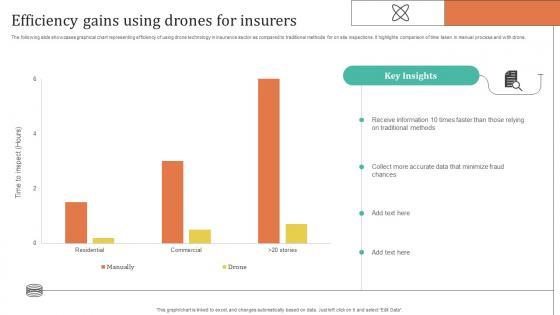 The following slide showcases graphical chart representing efficiency of using drone technology in insurance sector as compared to traditional methods for on site inspections. It highlights comparison of time taken in manual process and with drone. Explore a selection of the finest Technology Trends In Online Insurance Efficiency Gains Using Drones For Insurers here. With a plethora of professionally designed and pre-made slide templates, you can quickly and easily find the right one for your upcoming presentation. You can use our Technology Trends In Online Insurance Efficiency Gains Using Drones For Insurers to effectively convey your message to a wider audience. Slidegeeks has done a lot of research before preparing these presentation templates. The content can be personalized and the slides are highly editable. Grab templates today from Slidegeeks. The following slide showcases graphical chart representing efficiency of using drone technology in insurance sector as compared to traditional methods for on site inspections. It highlights comparison of time taken in manual process and with drone.
