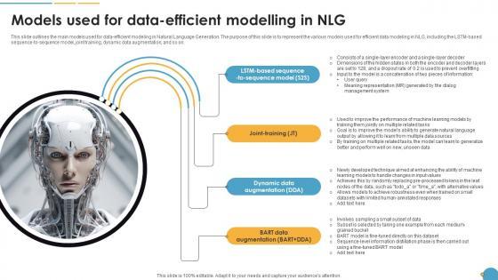 This slide outlines the main models used for data-efficient modeling in Natural Language Generation. The purpose of this slide is to represent the various models used for efficient data modeling in NLG, including the LSTM-based sequence-to-sequence model, joint training, dynamic data augmentation, and so on. This Models Used For Data Efficient Modelling In NLG AI Content Creation It Ppt Presentation from Slidegeeks makes it easy to present information on your topic with precision. It provides customization options, so you can make changes to the colors, design, graphics, or any other component to create a unique layout. It is also available for immediate download, so you can begin using it right away. Slidegeeks has done good research to ensure that you have everything you need to make your presentation stand out. Make a name out there for a brilliant performance. This slide outlines the main models used for data-efficient modeling in Natural Language Generation. The purpose of this slide is to represent the various models used for efficient data modeling in NLG, including the LSTM-based sequence-to-sequence model, joint training, dynamic data augmentation, and so on.