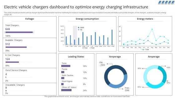 This slide includes an electric vehicle charger dashboard that enable real-time monitoring for instance maintenance and issue resolution.it includes elements such as total chargers, in line chargers, available chargers, energy usage, etc. If you are looking for a format to display your unique thoughts, then the professionally designed Empowering The Future Electric Vehicle Chargers Dashboard To Optimize Energy IoT SS V is the one for you. You can use it as a Google Slides template or a PowerPoint template. Incorporate impressive visuals, symbols, images, and other charts. Modify or reorganize the text boxes as you desire. Experiment with shade schemes and font pairings. Alter, share or cooperate with other people on your work. Download Empowering The Future Electric Vehicle Chargers Dashboard To Optimize Energy IoT SS V and find out how to give a successful presentation. Present a perfect display to your team and make your presentation unforgettable. This slide includes an electric vehicle charger dashboard that enable real-time monitoring for instance maintenance and issue resolution.it includes elements such as total chargers, in line chargers, available chargers, energy usage, etc.