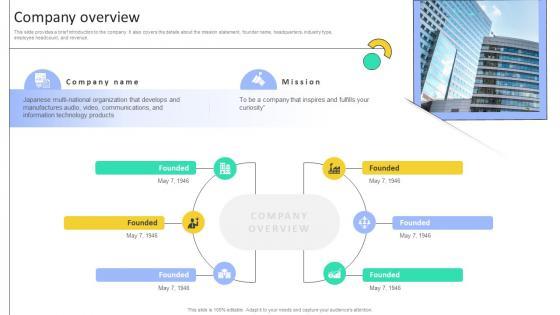 This slide provides a brief introduction to the company. It also covers the details about the mission statement, founder name, headquarters, industry type, employee headcount, and revenue. Boost your pitch with our creative Company Overview Electronic Company Business Model BMC SS V. Deliver an awe-inspiring pitch that will mesmerize everyone. Using these presentation templates you will surely catch everyones attention. You can browse the ppts collection on our website. We have researchers who are experts at creating the right content for the templates. So you do not have to invest time in any additional work. Just grab the template now and use them. This slide provides a brief introduction to the company. It also covers the details about the mission statement, founder name, headquarters, industry type, employee headcount, and revenue.