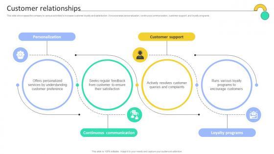 This slide showcases the companys various activities to increase customer loyalty and satisfaction. It incorporates personalization, continuous communication, customer support, and loyalty programs. Slidegeeks is one of the best resources for PowerPoint templates. You can download easily and regulate Customer Relationships Electronic Company Business Model BMC SS V for your personal presentations from our wonderful collection. A few clicks is all it takes to discover and get the most relevant and appropriate templates. Use our Templates to add a unique zing and appeal to your presentation and meetings. All the slides are easy to edit and you can use them even for advertisement purposes. This slide showcases the companys various activities to increase customer loyalty and satisfaction. It incorporates personalization, continuous communication, customer support, and loyalty programs.
