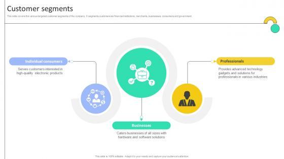 This slide covers the various targeted customer segments of the company. It segments customers as financial institutions, merchants, businesses, consumers and government. Want to ace your presentation in front of a live audience Our Customer Segments Electronic Company Business Model BMC SS V can help you do that by engaging all the users towards you. Slidegeeks experts have put their efforts and expertise into creating these impeccable powerpoint presentations so that you can communicate your ideas clearly. Moreover, all the templates are customizable, and easy-to-edit and downloadable. Use these for both personal and commercial use. This slide covers the various targeted customer segments of the company. It segments customers as financial institutions, merchants, businesses, consumers and government.