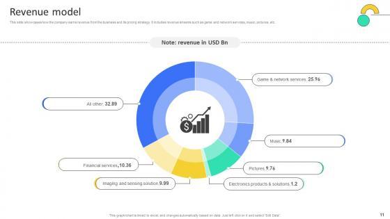 This slide showcases how the company earns revenue from the business and its pricing strategy. It includes revenue streams such as game and network services, music, pictures, etc. Find highly impressive Revenue Model Electronic Company Business Model BMC SS V on Slidegeeks to deliver a meaningful presentation. You can save an ample amount of time using these presentation templates. No need to worry to prepare everything from scratch because Slidegeeks experts have already done a huge research and work for you. You need to download Revenue Model Electronic Company Business Model BMC SS V for your upcoming presentation. All the presentation templates are 100 percent editable and you can change the color and personalize the content accordingly. Download now This slide showcases how the company earns revenue from the business and its pricing strategy. It includes revenue streams such as game and network services, music, pictures, etc.