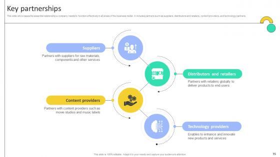 This slide showcases the essential relationship a company needs to function effectively in all areas of the business model. It includes partners such as suppliers, distributors and retailers, content providers, and technology partners. Present like a pro with Key Partnerships Electronic Company Business Model BMC SS V. Create beautiful presentations together with your team, using our easy-to-use presentation slides. Share your ideas in real-time and make changes on the fly by downloading our templates. So whether you are in the office, on the go, or in a remote location, you can stay in sync with your team and present your ideas with confidence. With Slidegeeks presentation got a whole lot easier. Grab these presentations today. This slide showcases the essential relationship a company needs to function effectively in all areas of the business model. It includes partners such as suppliers, distributors and retailers, content providers, and technology partners.