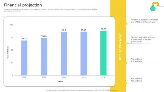 This slide presents the financial projections showcasing the companys anticipated growth. The predictions are based on comprehensive market analysis and historical performance. There are so many reasons you need a Financial Projection Electronic Company Business Model BMC SS V. The first reason is you can not spend time making everything from scratch, Thus, Slidegeeks has made presentation templates for you too. You can easily download these templates from our website easily. This slide presents the financial projections showcasing the companys anticipated growth. The predictions are based on comprehensive market analysis and historical performance.