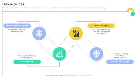 This slide covers the most curtailed activity the company performs to operate a business successfully. It includes research and development, manufacturing, sales and marketing, innovation, and design. Get a simple yet stunning designed Key Activities Electronic Company Business Model BMC SS V. It is the best one to establish the tone in your meetings. It is an excellent way to make your presentations highly effective. So, download this PPT today from Slidegeeks and see the positive impacts. Our easy-to-edit Key Activities Electronic Company Business Model BMC SS V can be your go-to option for all upcoming conferences and meetings. So, what are you waiting for Grab this template today. This slide covers the most curtailed activity the company performs to operate a business successfully. It includes research and development, manufacturing, sales and marketing, innovation, and design.