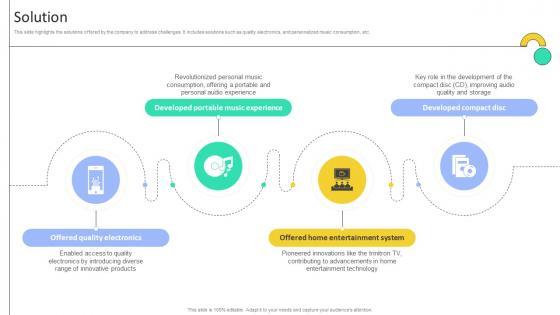 This slide highlights the solutions offered by the company to address challenges. It includes solutions such as quality electronics, and personalized music consumption, etc. If your project calls for a presentation, then Slidegeeks is your go-to partner because we have professionally designed, easy-to-edit templates that are perfect for any presentation. After downloading, you can easily edit Solution Electronic Company Business Model BMC SS V and make the changes accordingly. You can rearrange slides or fill them with different images. Check out all the handy templates This slide highlights the solutions offered by the company to address challenges. It includes solutions such as quality electronics, and personalized music consumption, etc.