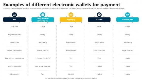 The below slide showcases the comparative analysis of multiple e-wallets that are used for financial payments. The different digital wallets assessed are Google Wallet, Apple Pay, Venmo, and Amazon Pay. Formulating a presentation can take up a lot of effort and time, so the content and message should always be the primary focus. The visuals of the PowerPoint can enhance the presenters message, so our Examples Of Different Electronic Wallets For Payment In Depth Guide To Digital Wallets Fin SS V was created to help save time. Instead of worrying about the design, the presenter can concentrate on the message while our designers work on creating the ideal templates for whatever situation is needed. Slidegeeks has experts for everything from amazing designs to valuable content, we have put everything into Examples Of Different Electronic Wallets For Payment In Depth Guide To Digital Wallets Fin SS V. The below slide showcases the comparative analysis of multiple e-wallets that are used for financial payments. The different digital wallets assessed are Google Wallet, Apple Pay, Venmo, and Amazon Pay.