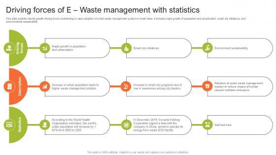 This slide exhibits market growth driving forces contributing to rapid adoption of smart waste management system in smart cities. It includes rapid growth of population and urbanization, smart city initiatives, and environmental sustainability. Get a simple yet stunning designed Driving Forces Of E Waste Step By Step Guide For Electronic Ppt Slide. It is the best one to establish the tone in your meetings. It is an excellent way to make your presentations highly effective. So, download this PPT today from Slidegeeks and see the positive impacts. Our easy-to-edit Driving Forces Of E Waste Step By Step Guide For Electronic Ppt Slide can be your go-to option for all upcoming conferences and meetings. So, what are you waiting for Grab this template today. This slide exhibits market growth driving forces contributing to rapid adoption of smart waste management system in smart cities. It includes rapid growth of population and urbanization, smart city initiatives, and environmental sustainability.